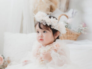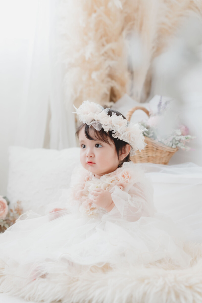 座ったポーズやハイハイの姿もふんわりと華やかに写ります。