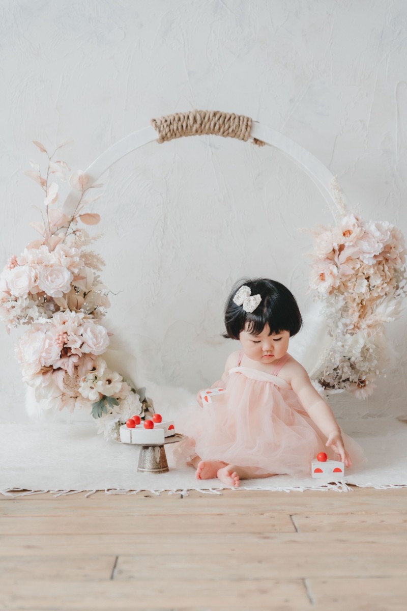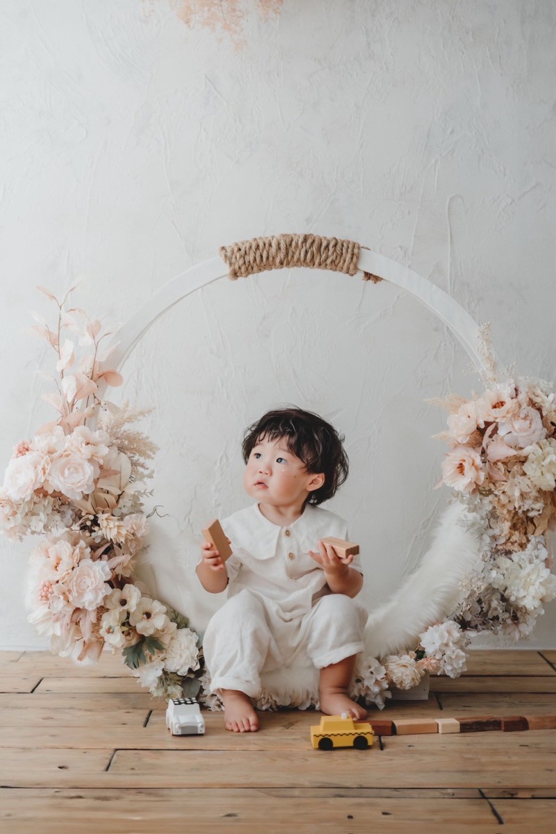 あたたかい木のぬくもりを感じる床、フラワークレイドル(白いゆりかご)を使った、透明感のあるやわらかな写真を残しています。